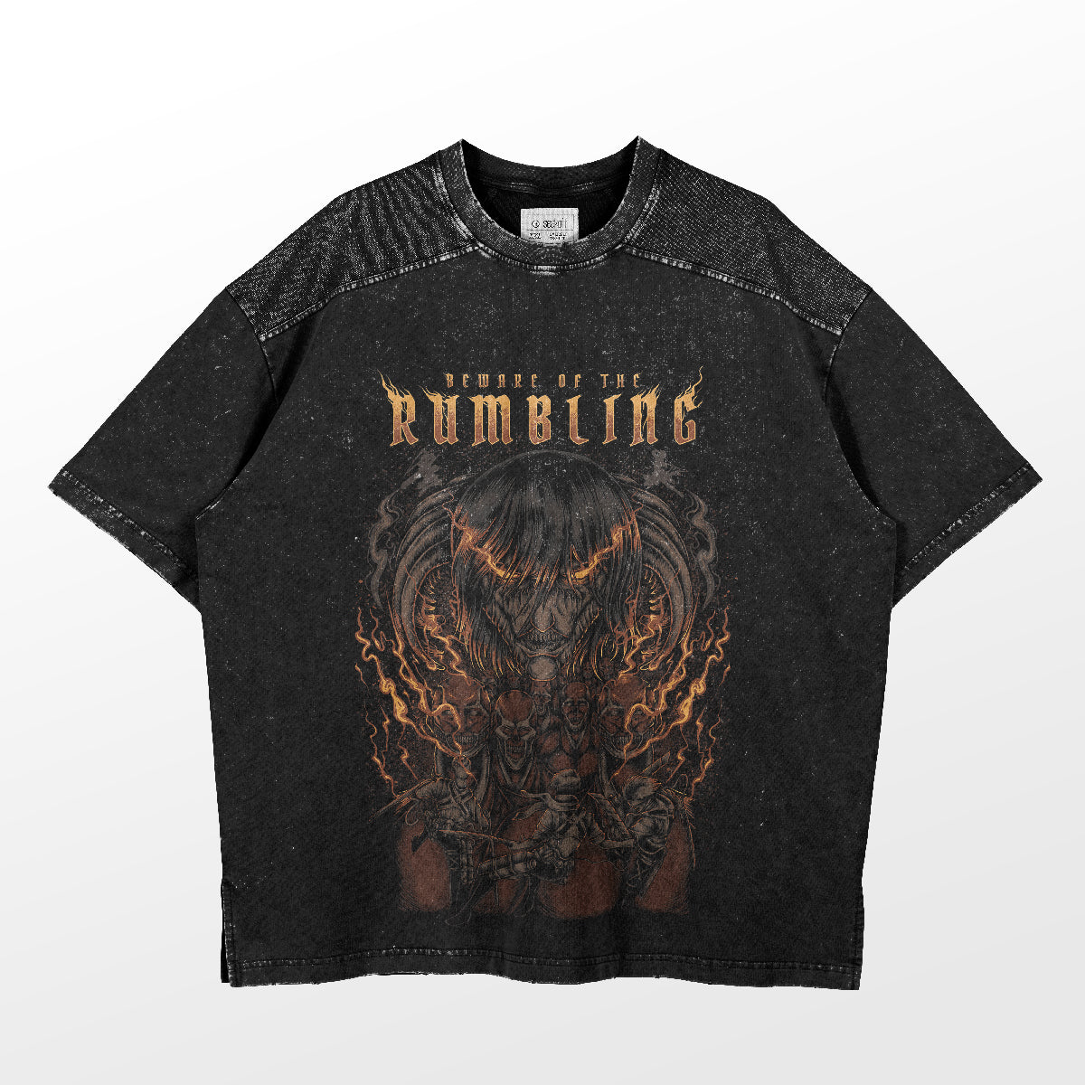 • Print: High-quality, vibrant illustration of Eren Yeager and the Wall Titans with "Beware of the Rumbling" text