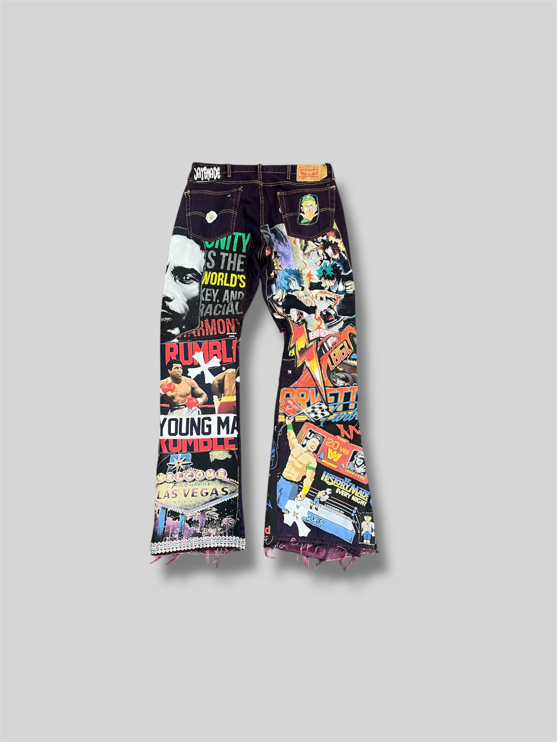 Levis created with t shirts jersey numbers, logos, tapestry, scraps, charms, bedazzles & gems.The eyes of graphic t have bedazzles to which give an alien like effect. There are charms gems & bedazzles places all over the jeans for extra detail.These jeans also include yarn stitch to pop out patches. These jeans are based around sport hip-hop & pop culture.