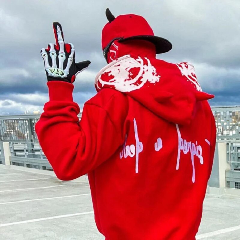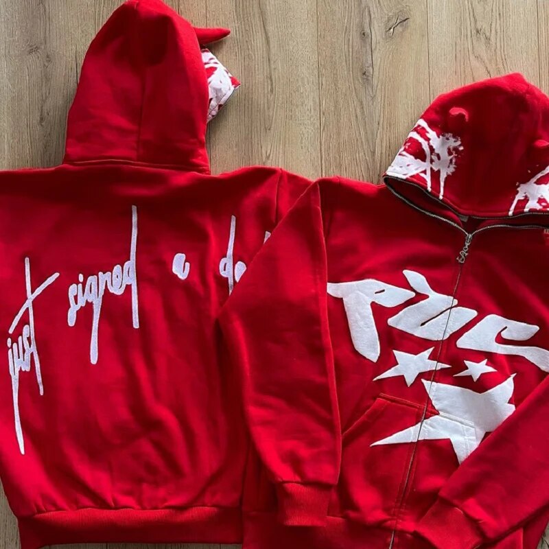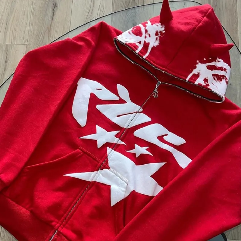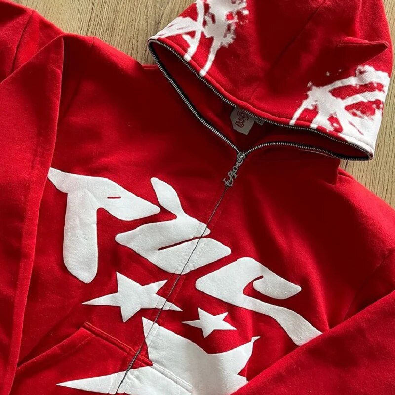 Red Hoodie Print Zip Up Hoodies Hip Hop Loose Grunge Hooded Sweatshirt