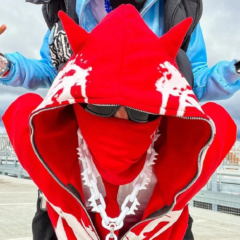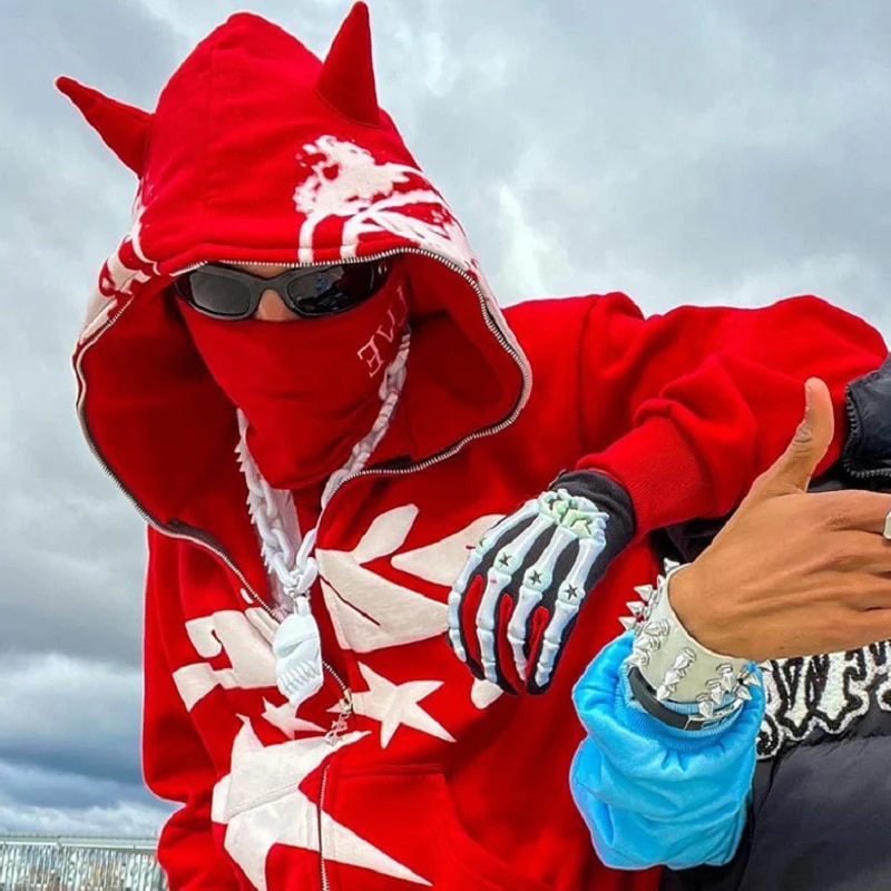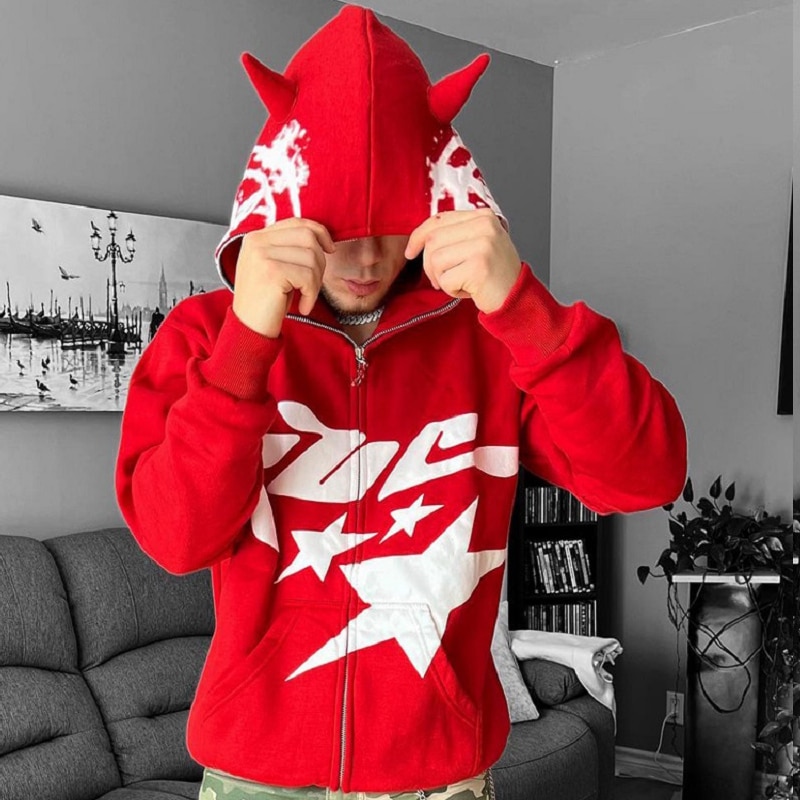 Unique Red Hoodie Print Design: The Red Hoodie Print Zip Up Hoodies feature a distinct and eye-catching design that combines the classic appeal of red with a grunge-inspired aesthetic. The printed graphics and patterns on the hoodie add a unique and edgy touch, making it perfect for those who want to stand out and make a bold fashion statement in the world of hip hop and streetwear.